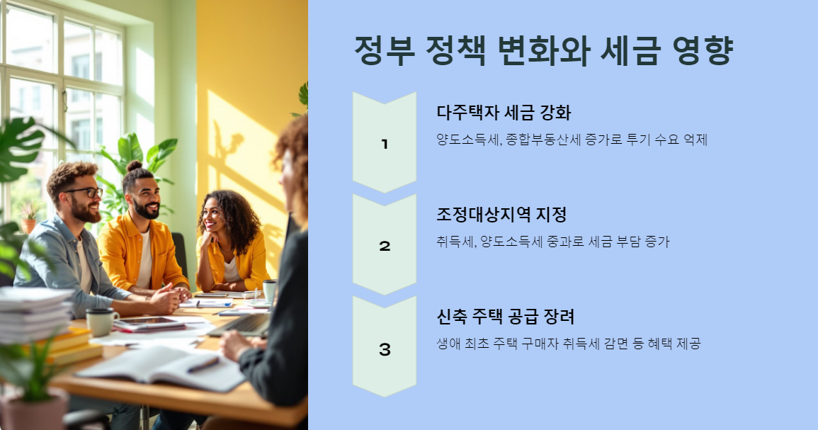 정부의 부동산 세금 정책은 시장 상황과 국가 경제를 조정하기 위해 자주 변경돼요. 예를 들어, 최근 몇 년간 다주택자에 대한 양도소득세와 종합부동산세가 강화되었죠. 이는 부동산 시장의 과열을 막고 투기 수요를 억제하기 위한 정책이었어요.