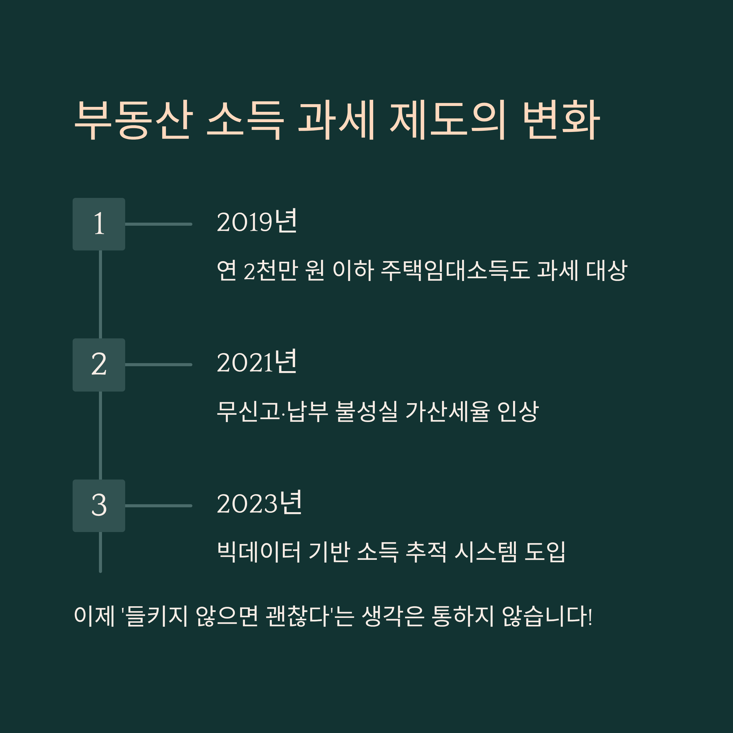 이제부터는 각 섹션별로 구체적인 내용과 사례를 통해, 가산세 없이 안전하게 부동산 소득을 관리하는 방법을 알려드릴게요. 내용이 길어서 다음 박스에서 ‘부동산 소득 과세 제도의 변화’부터 이어갈게요.