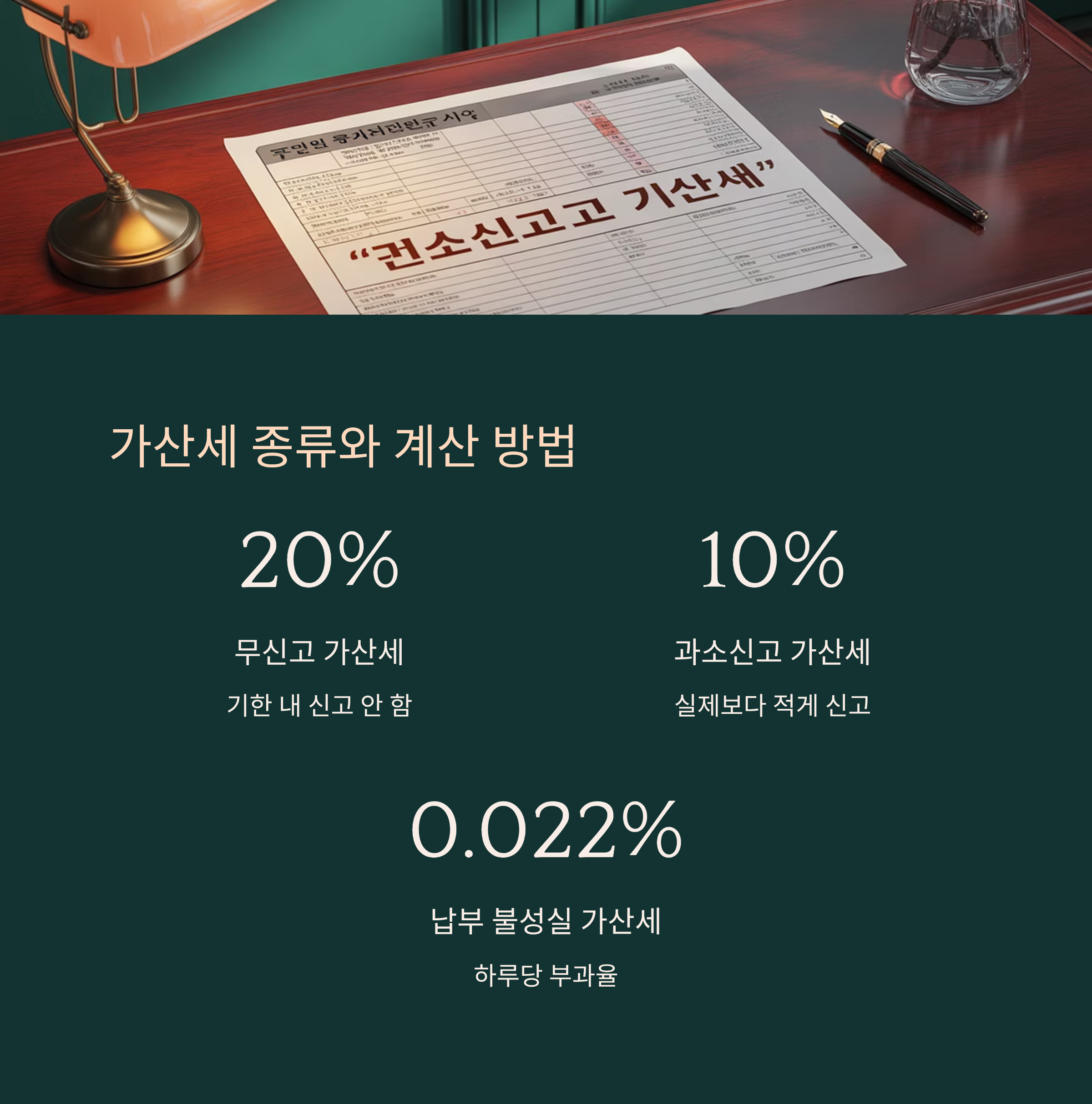 가산세는 세금을 제때 신고하거나 납부하지 않았을 때 부과되는 추가 금액이에요. 부동산 소득과 관련해 자주 발생하는 가산세는 ‘무신고 가산세’, ‘과소신고 가산세’, 그리고 ‘납부 불성실 가산세’ 세 가지예요. 각각의 부과 조건과 계산 방법을 알면, 미리 예방할 수 있어요.
