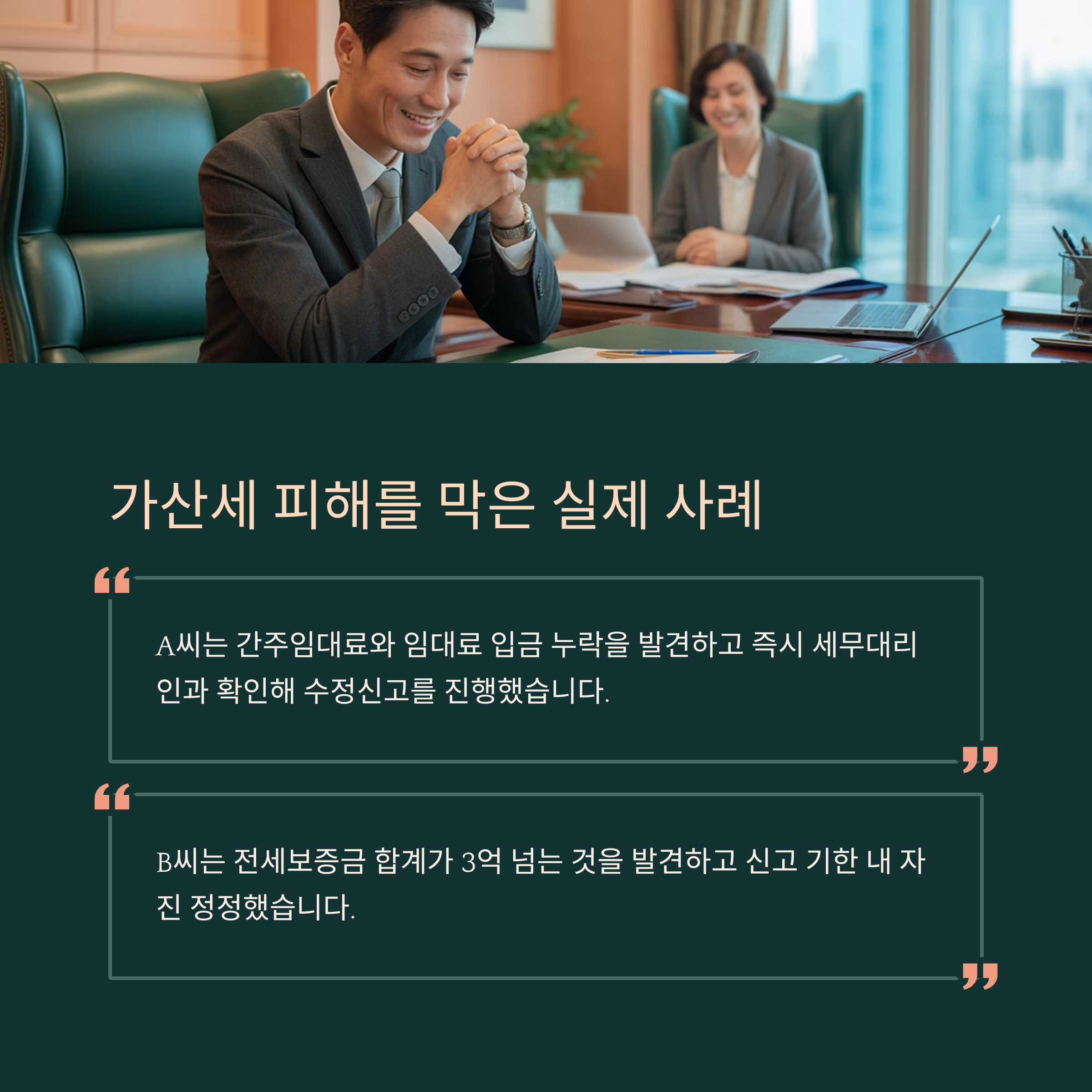 | B씨 | 보증금 합산 인지 부족 | 기한 내 자진 정정 | 가산세 최소화 |