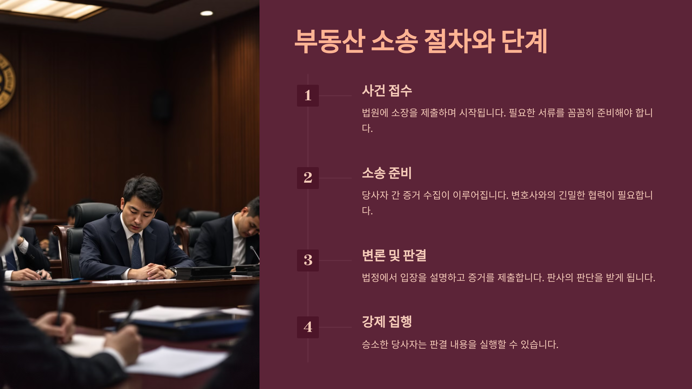 부동산 소송은 일반적으로 사건 접수, 소송 준비, 변론 및 판결, 강제 집행의 단계를 거쳐요. 먼저 사건 접수는 법원에 소장을 제출하는 것으로 시작돼요. 이때 필요한 서류를 꼼꼼히 준비하는 것이 중요해요.