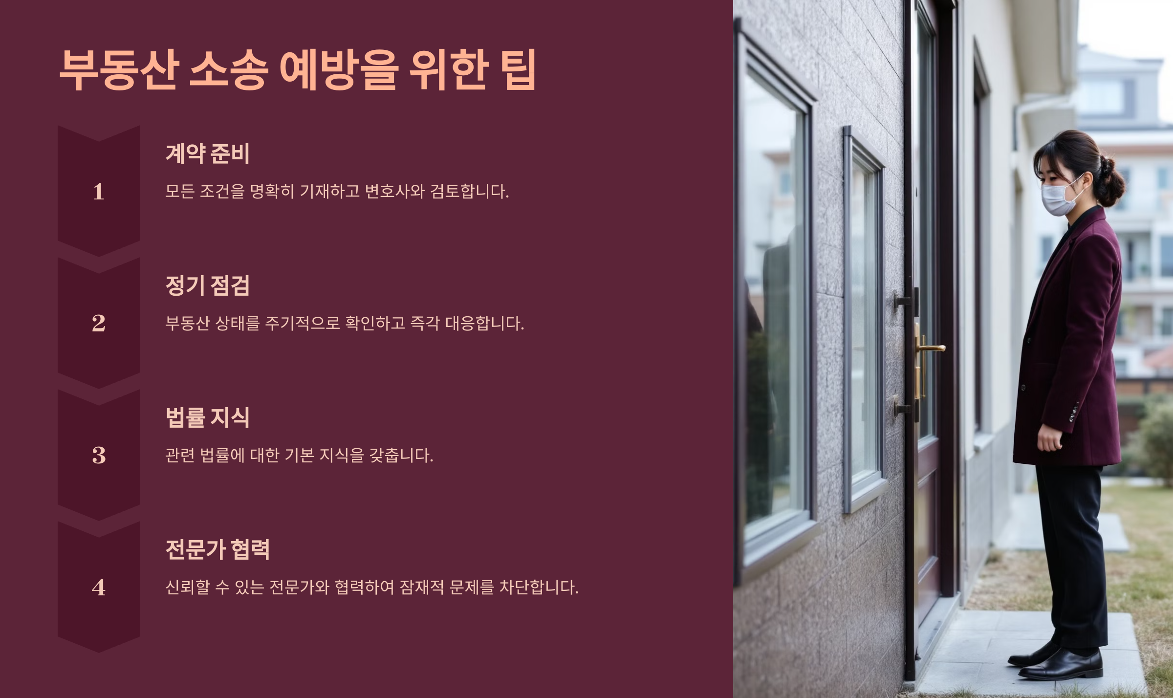 부동산 소송을 예방하려면 **계약 단계에서 철저히 준비**하는 것이 가장 중요해요. 계약서에 모든 조건을 명확히 기재하고, 필요시 변호사와 함께 검토하는 것이 좋아요. 구두로 합의한 사항은 문서로 기록해야 법적 효력을 가질 수 있어요.