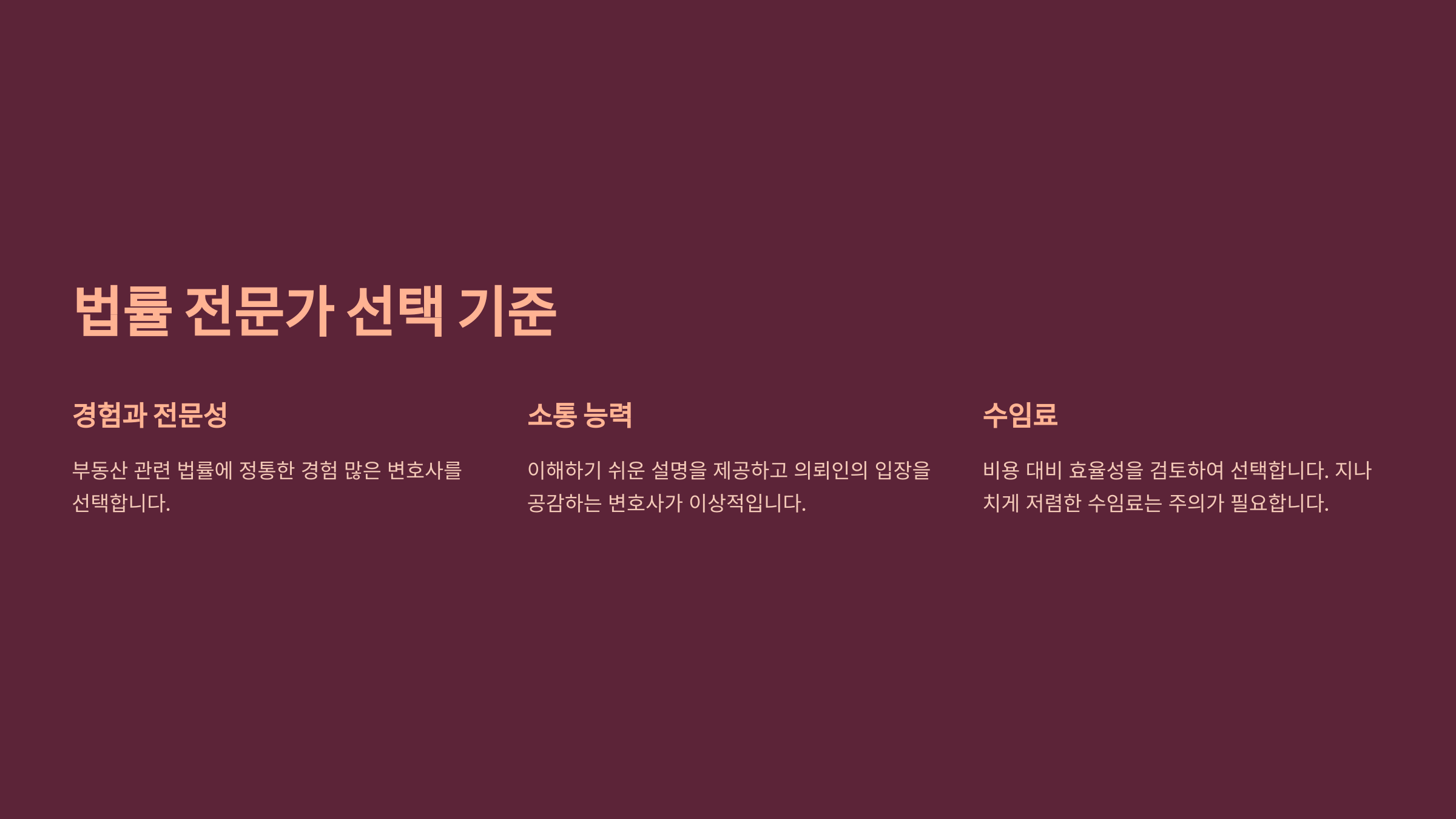 부동산 소송에서는 **경험 많은 법률 전문가**를 선택하는 것이 핵심이에요. 변호사의 경력, 성공 사례, 그리고 부동산 관련 법률에 대한 전문성이 중요하답니다. 부동산 법률에 정통한 전문가를 찾으면 복잡한 절차를 보다 수월하게 진행할 수 있어요.