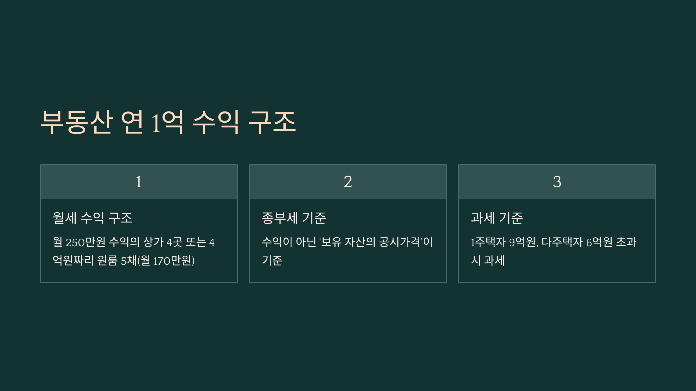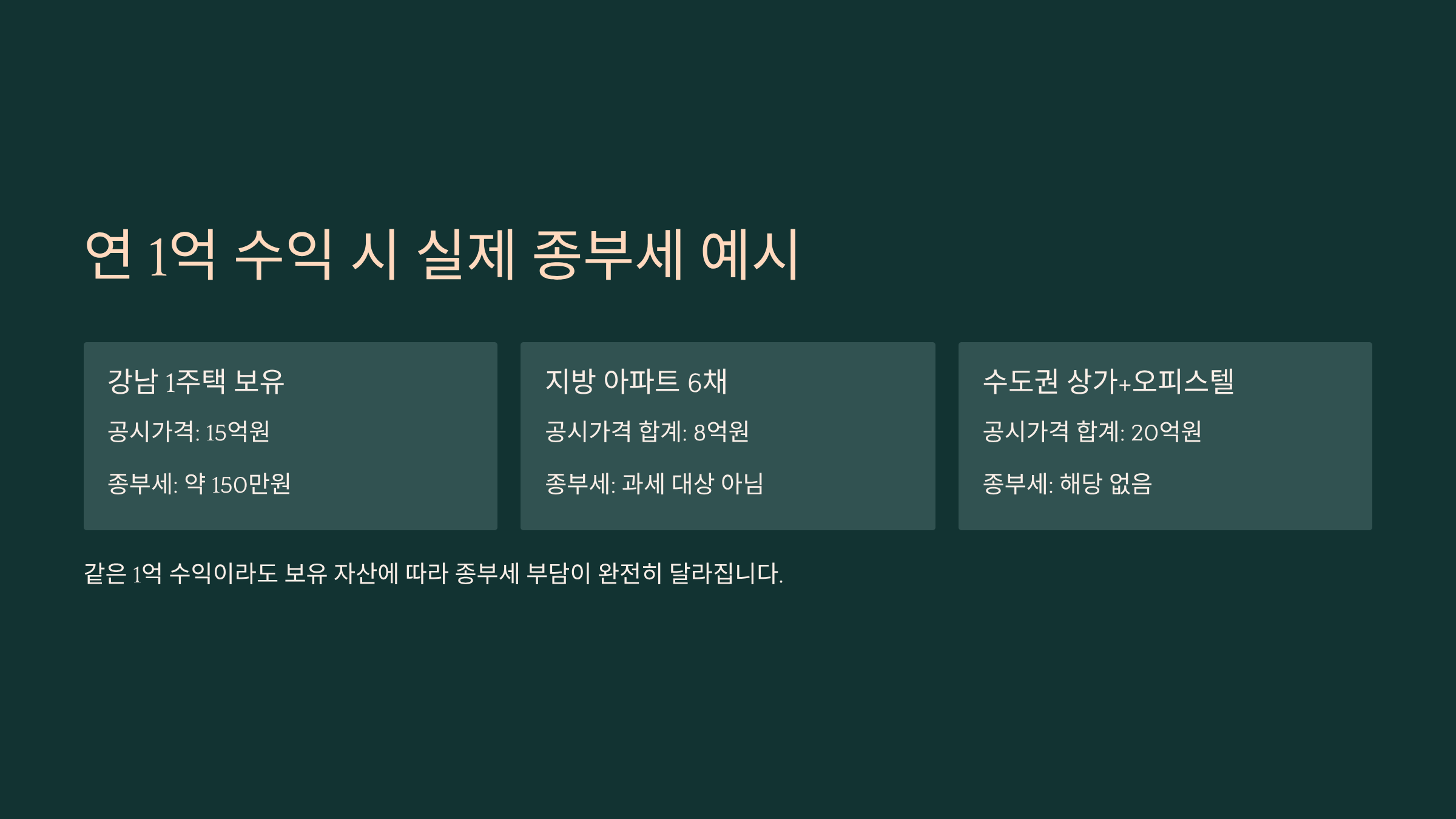 그럼 이제 실제로 부동산 수익이 연 1억 원 정도일 때, 종합부동산세가 얼마나 나오는지 구체적인 케이스를 살펴볼게요. 여기서는 대표적인 세 가지 시나리오를 가정해 계산해볼 거예요. 각각 공시가격과 보유 부동산 종류가 다른 상황이죠.