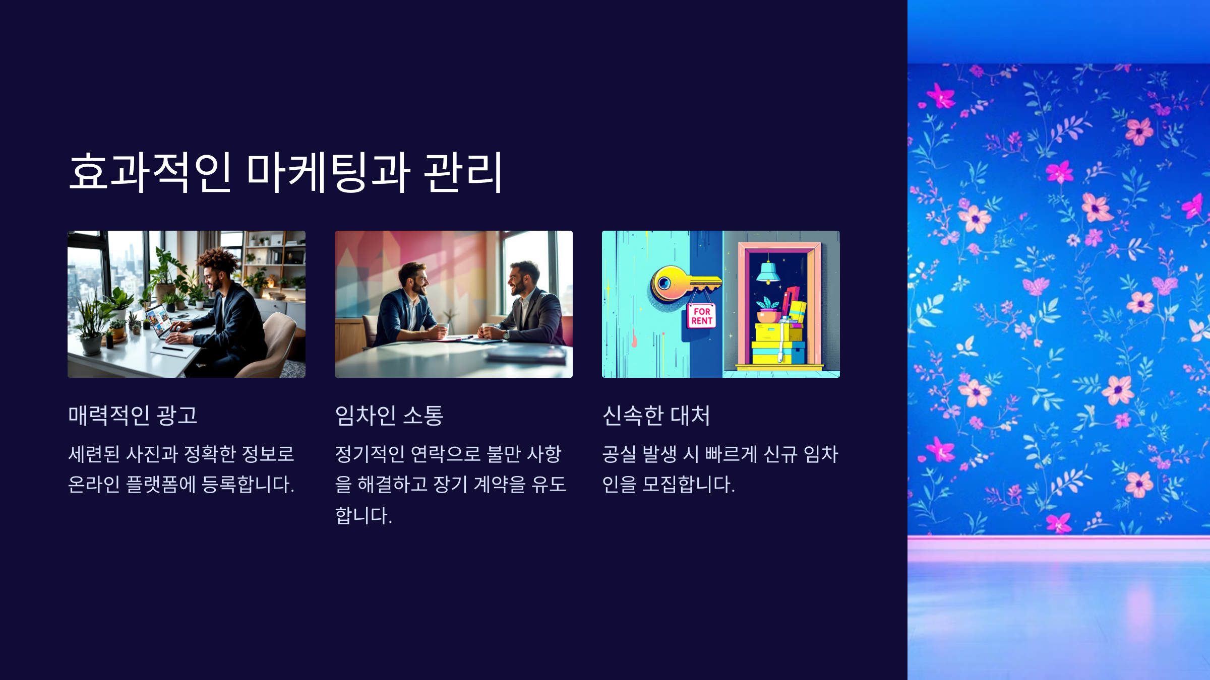 세 번째로, 효과적인 마케팅과 관리를 통해 공실률을 낮추고 안정적인 수익을 얻을 수 있어요. 부동산의 장점을 잘 드러낼 수 있는 광고 문구와 사진을 활용해 온라인 플랫폼에 등록하는 것은 기본이에요. 임대인의 관심을 끌기 위해 세련된 사진과 정확한 정보를 제공해야 해요.