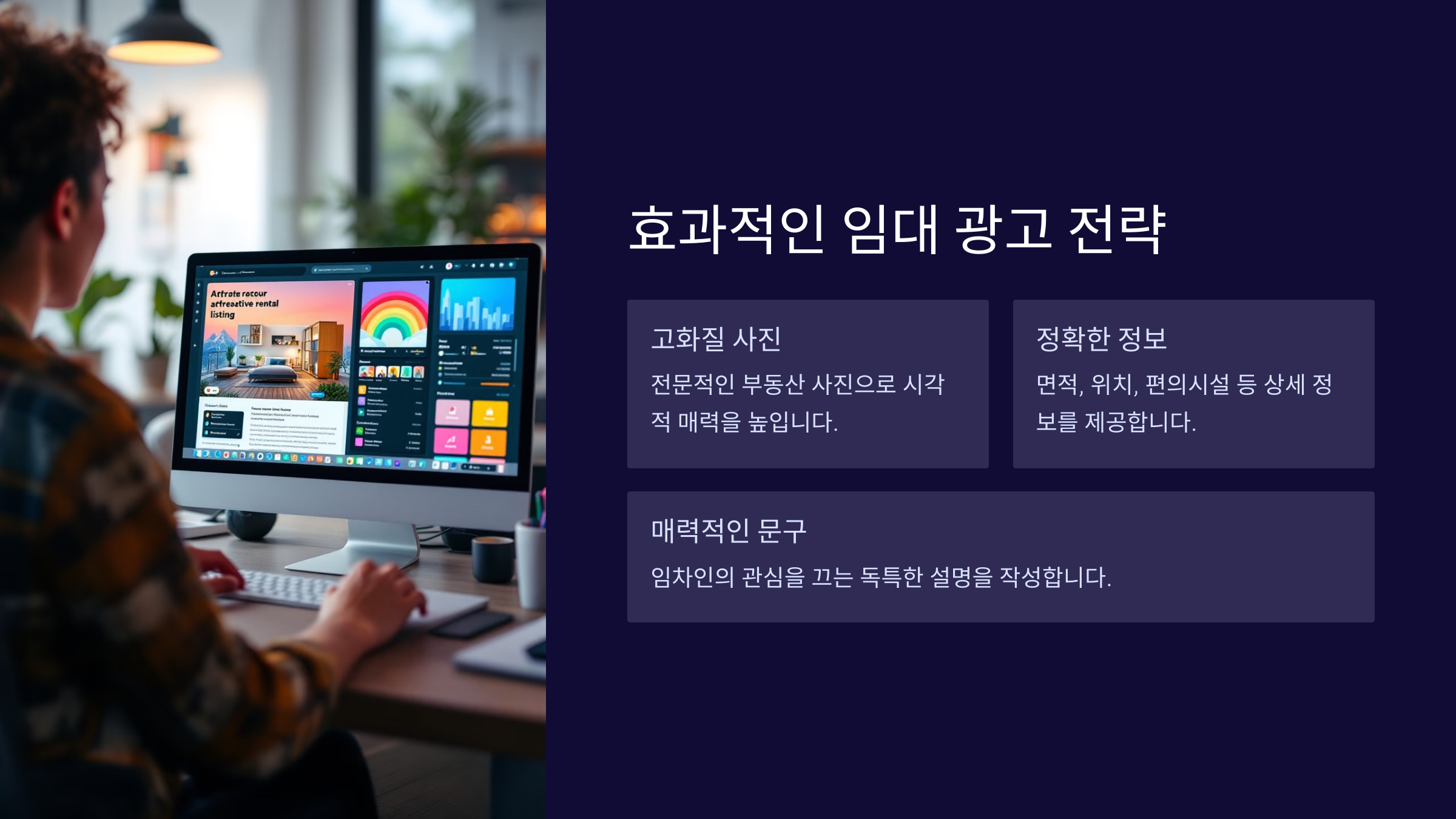 A3. 고화질 사진, 정확한 정보, 그리고 임차인을 끌어들이는 매력적인 문구가 핵심이에요.