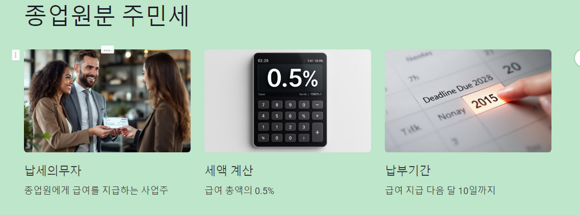 종업원에게 급여를 지급하는 사업주는 종업원분 주민세를 납부해야 합니다. 이는 사업장의 고용 규모에 따라 달라지는 세금으로, 고용 환경에 따른 지방재정 기여를 목적으로 합니다.