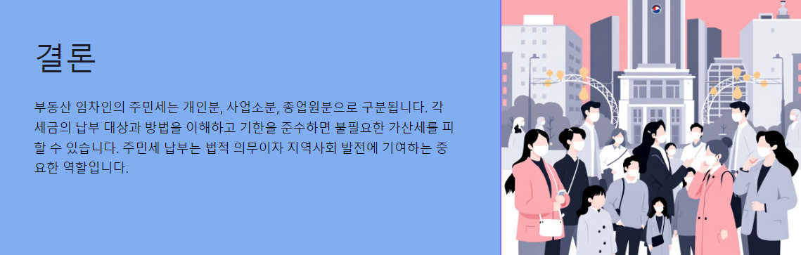 부동산 임차인이 납부해야 하는 주민세는 개인분, 사업소분, 종업원분으로 나뉘며, 각각의 세금은 납부 대상과 방법이 다릅니다. 기한을 준수하고, 과세 기준을 명확히 이해하면 불필요한 가산세를 피할 수 있습니다.