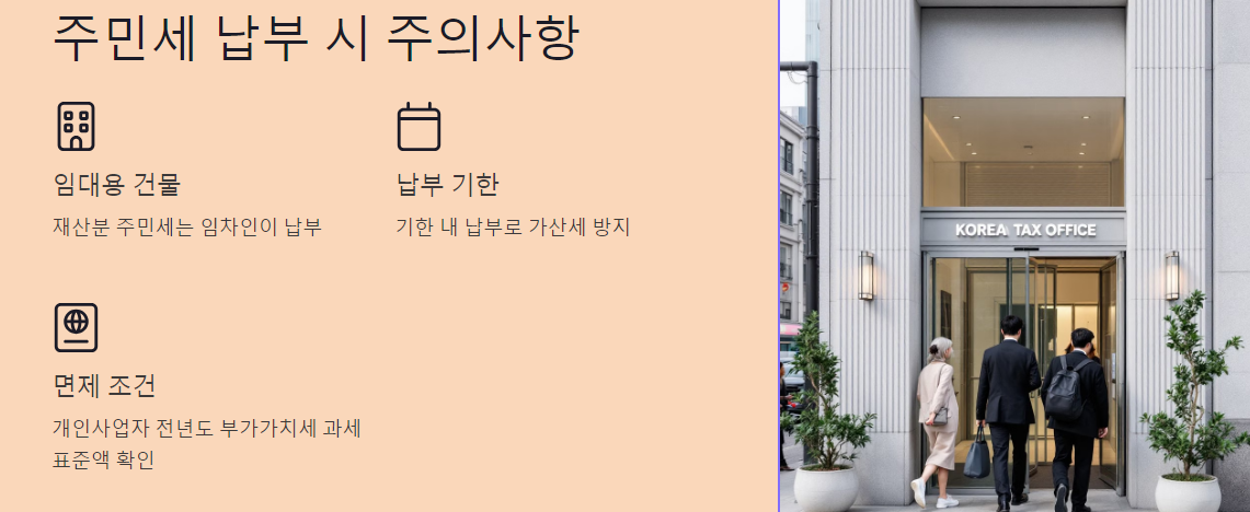 임대용 건물의 경우 재산분 주민세는 임차인이 납부해야 합니다. 이는 건물주의 의무가 아닌, 해당 공간을 사용하는 임차인의 의무임을 유념해야 합니다.