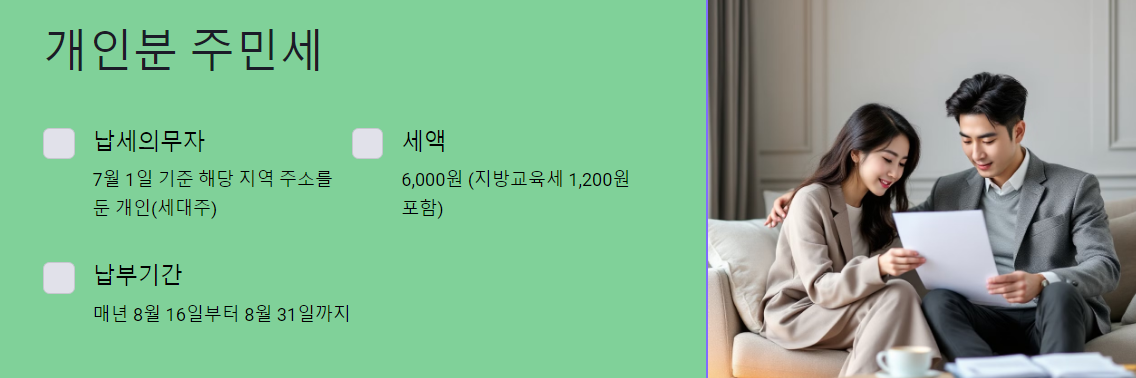개인분 주민세는 세액이 6,000원으로 고정되어 있으며, 지방교육세 1,200원이 포함된 금액입니다. 고지서를 통해 납부 안내를 받게 되며, 가상계좌 계좌이체나 ETAX와 같은 인터넷 서비스를 통해 편리하게 납부할 수 있습니다.