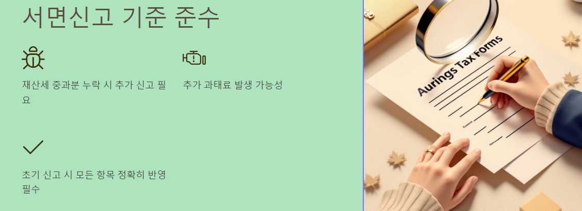 재산세 중과분을 누락하여 서면신고 기준에 미달하게 되면 추가 신고를 해야 하며, 이로 인해 추가 과태료가 발생할 수 있습니다. 따라서 초기 신고 시 모든 항목을 정확히 반영하는 것이 필수적입니다.