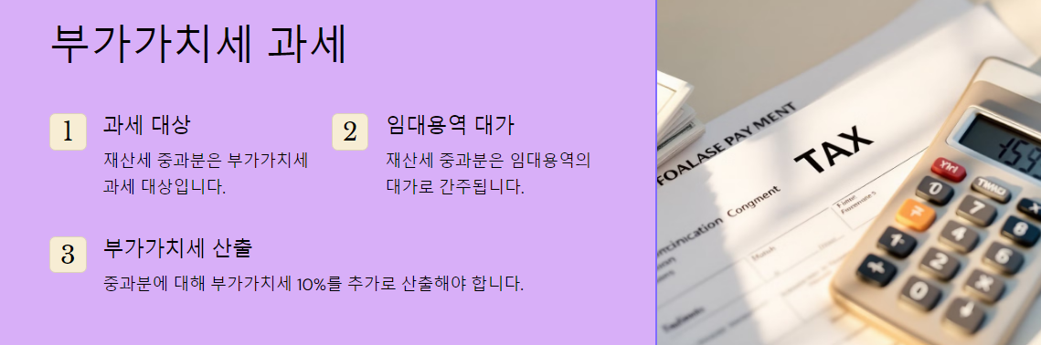 재산세 중과분은 부가가치세 과세 대상입니다. 이는 재산세 중과분이 임대용역의 대가로 간주되기 때문입니다. 예를 들어, 중과분 1,000,000원이 발생한 경우, 해당 금액에 대해 부가가치세 10%를 추가로 산출해야 합니다.