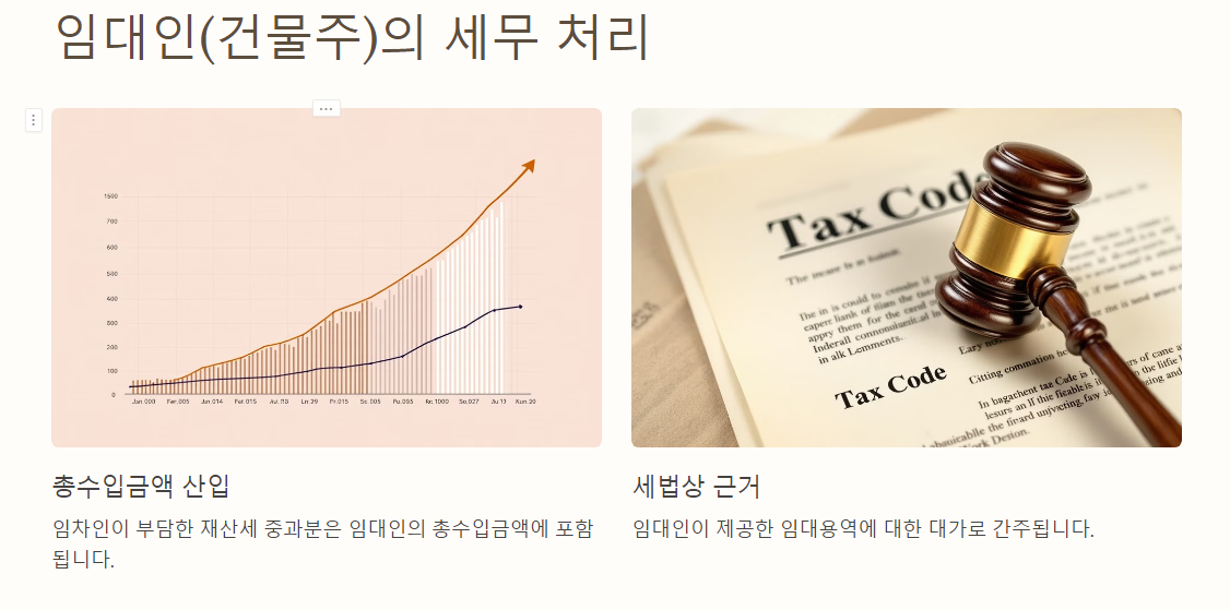 부동산 임차인이 부담하는 재산세 중과분은 임대인과 임차인 모두에게 중요한 세무 항목입니다. 임대인은 이를 총수입금액에 포함하고 세금계산서를 발행하며, 필요경비로 처리할 수 있습니다. 임차인은 해당 금액을 필요경비로 산입하여 세무 부담을 줄일 수 있습니다.