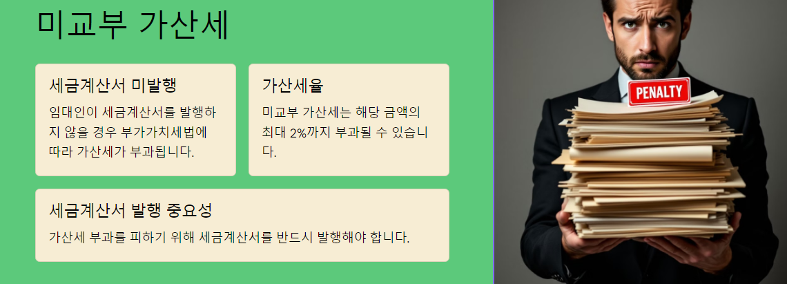 임대인이 세금계산서를 발행하지 않을 경우, 부가가치세법 제22조제2항에 따라 미교부 가산세가 적용됩니다. 이는 해당 금액의 최대 2%에 달할 수 있어, 세금계산서를 반드시 발행하는 것이 중요합니다.