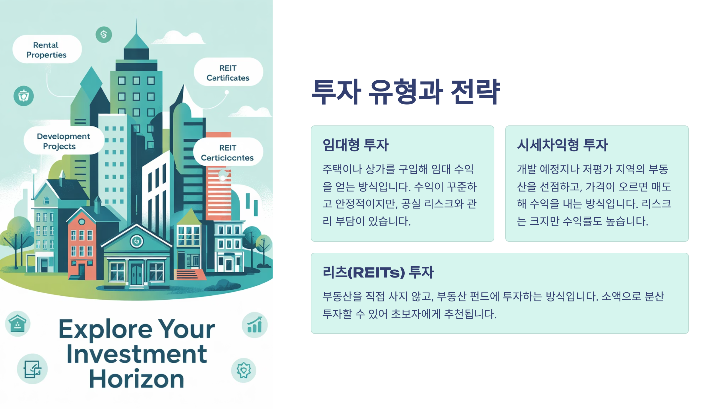 첫 번째는 '임대형 투자'예요. 주택이나 상가를 구입해 임대 수익을 얻는 방식이죠. 수익이 꾸준하고 안정적이지만, 공실 리스크나 관리 부담도 있어요. 월세와 전세 시장의 흐름을 꾸준히 분석해야 해요.