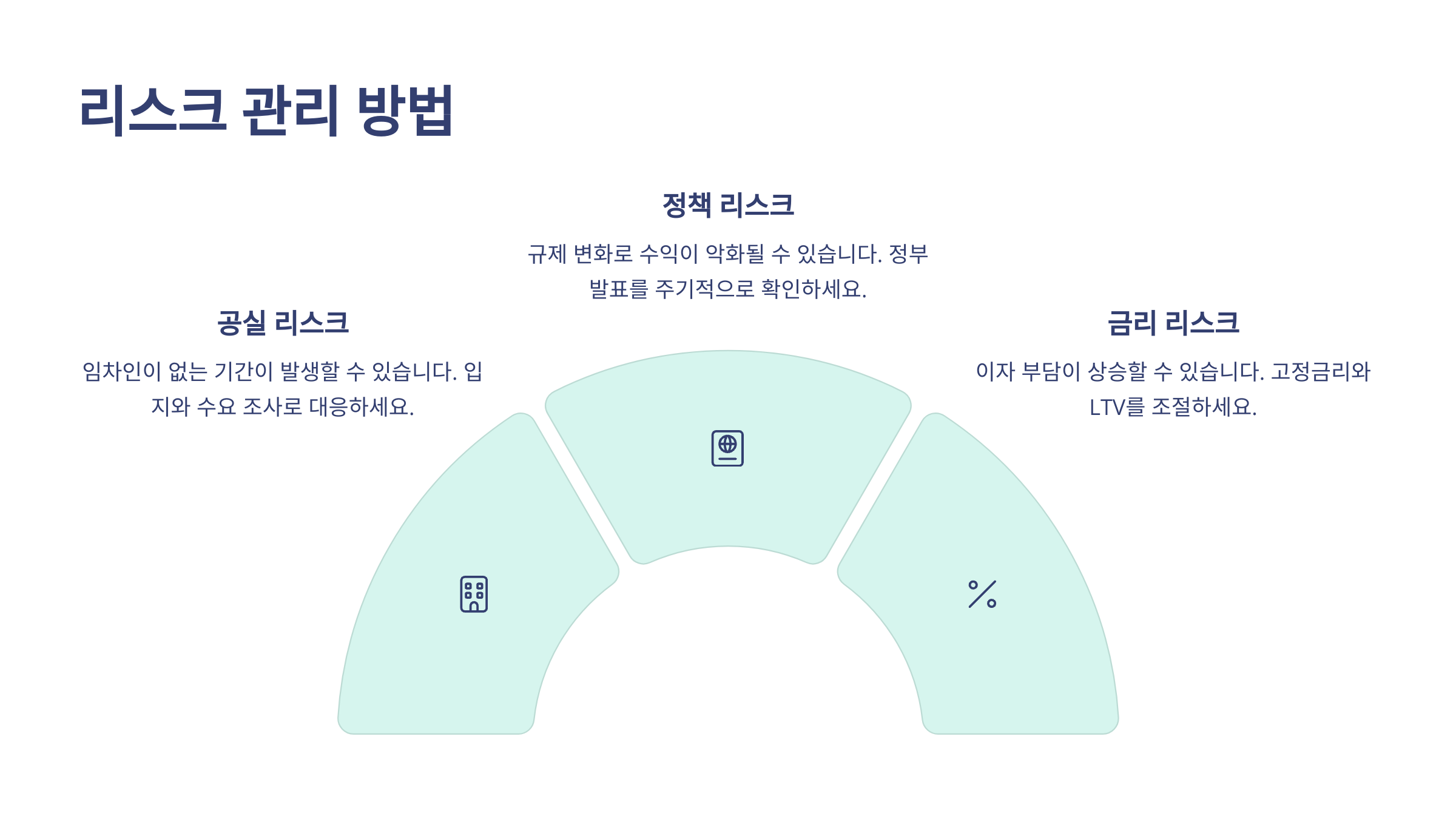 | 공실 리스크 | 임차인이 없는 기간 발생 | 입지, 수요 조사 |