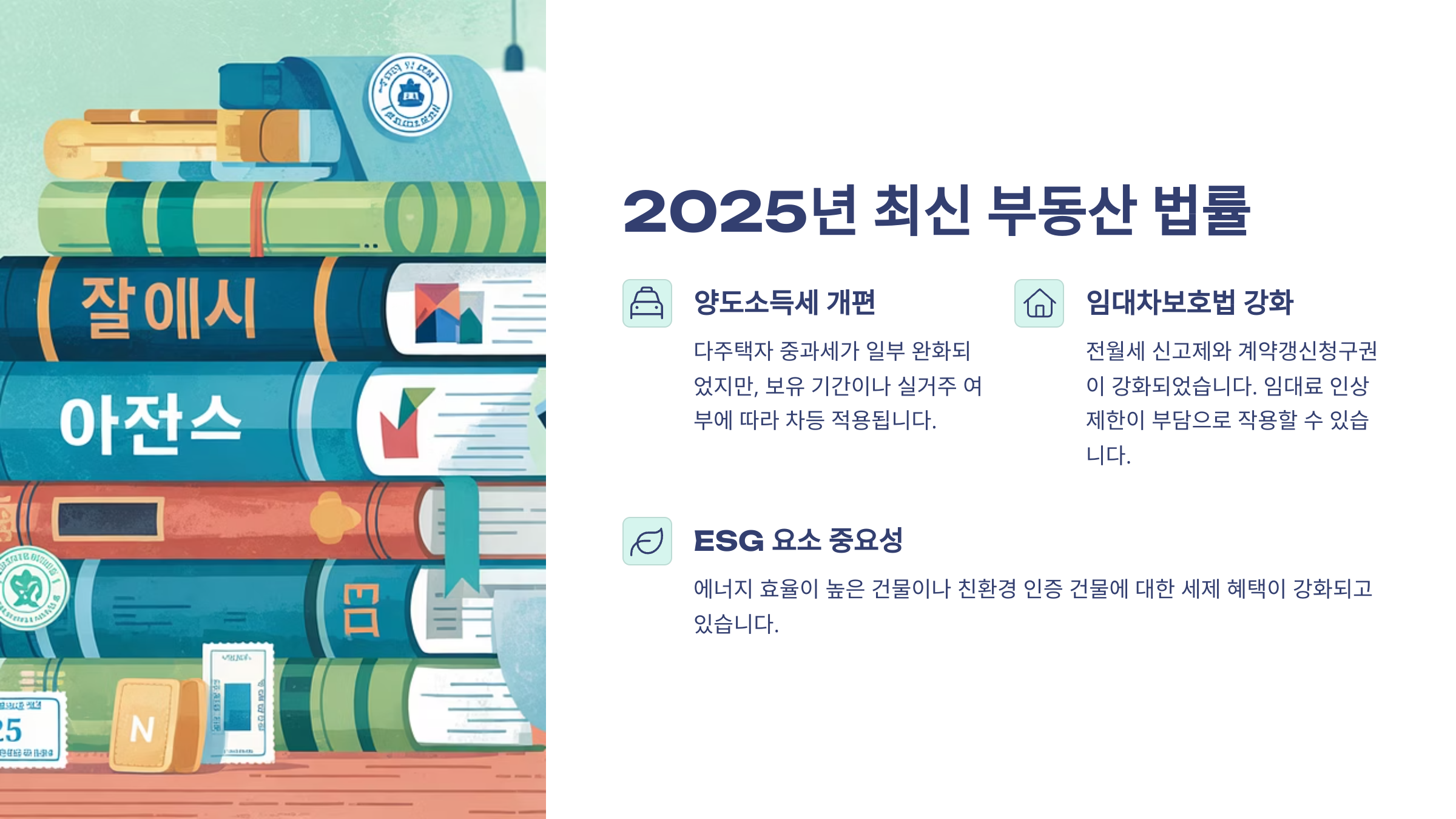 2025년에는 부동산 시장을 둘러싼 제도와 법률도 다소 변경되었어요. 특히 최근에는 실거주 목적과 투기 방지를 중심으로 한 정책들이 많이 반영되고 있어요. 투자자 입장에서는 이 변화들을 제대로 이해해야 유리한 위치를 점할 수 있어요.