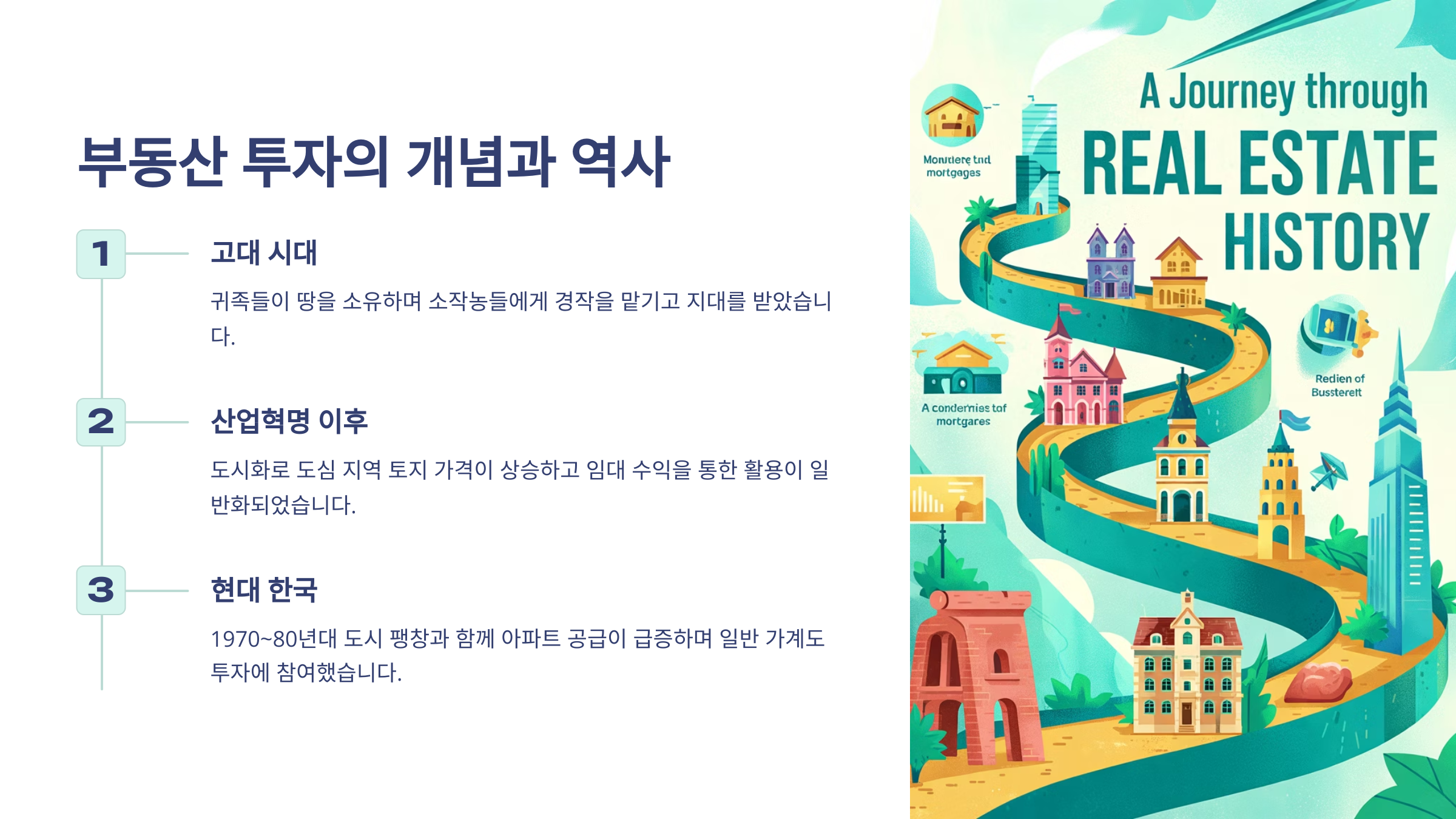 부동산 투자는 단순히 '집을 사고팔아 이익을 남긴다'는 개념을 넘어서, 다양한 자산 관리 방식 중 하나로 발전해 왔어요. 사람들은 예로부터 토지를 보유하고 이를 활용해 생계를 유지하거나 권력을 유지해왔는데요, 이러한 토지의 소유와 운영이 오늘날의 부동산 투자로 연결된 거예요.
