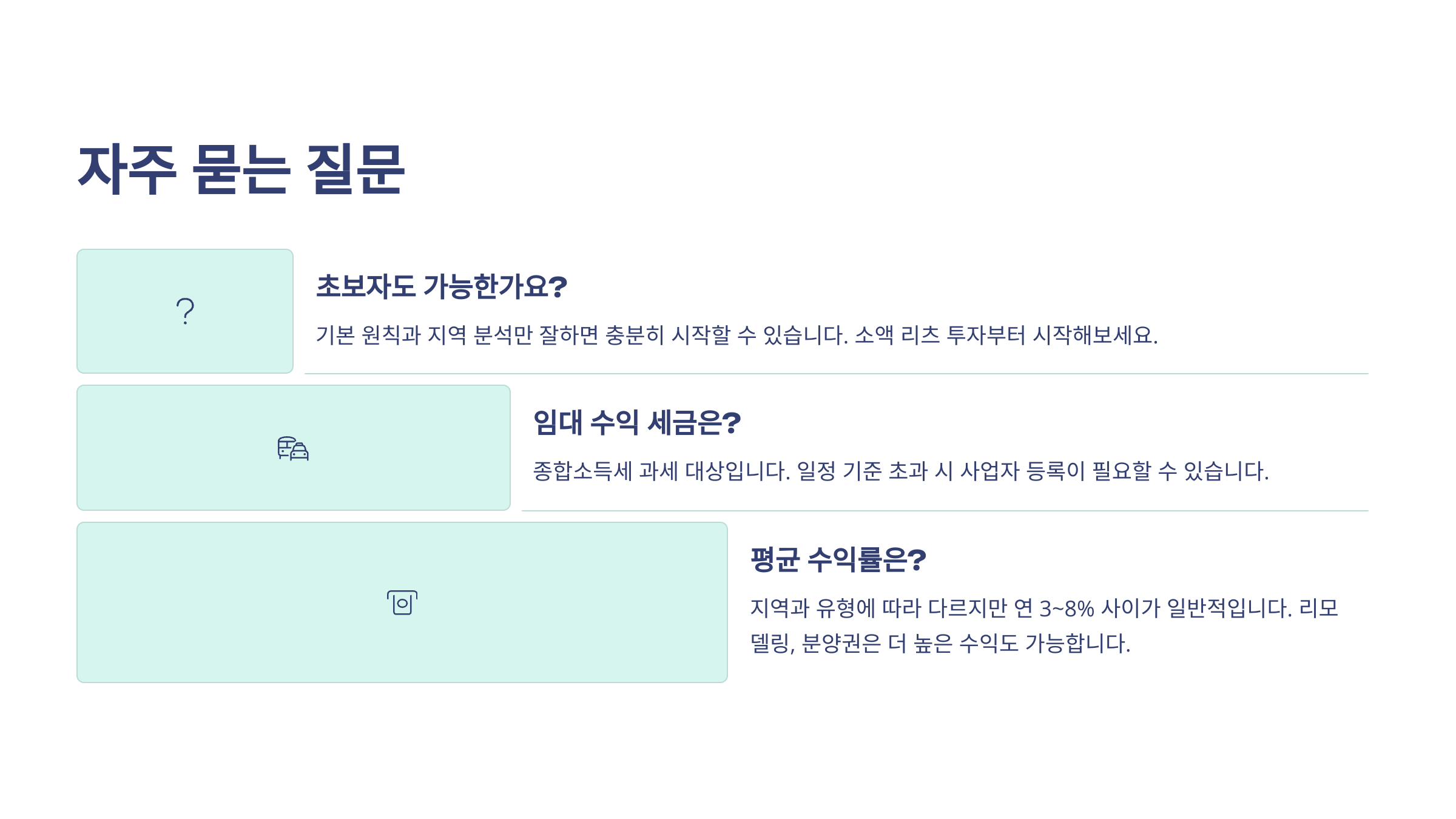 A1. 네, 초보자도 기본 원칙과 지역 분석만 잘하면 충분히 시작할 수 있어요. 소액 리츠 투자부터 시작하는 것도 좋은 방법이에요.
