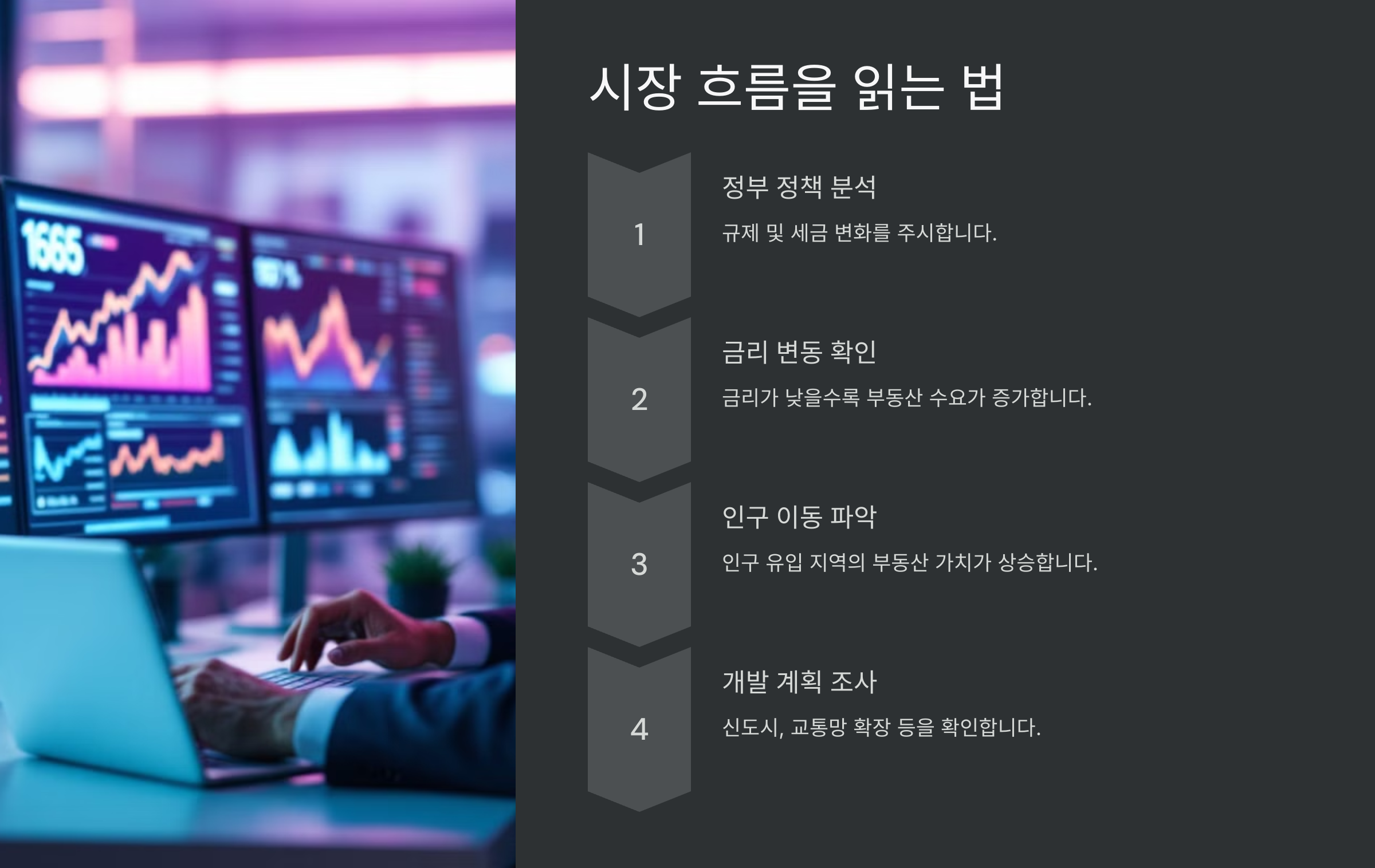 시장 흐름을 파악하려면 **정부 정책, 금리 변동, 인구 이동, 개발 계획** 등을 주의 깊게 살펴야 해요. 특히 금리 인상 시기에는 대출 부담이 커져 시장이 둔화될 가능성이 높아요.