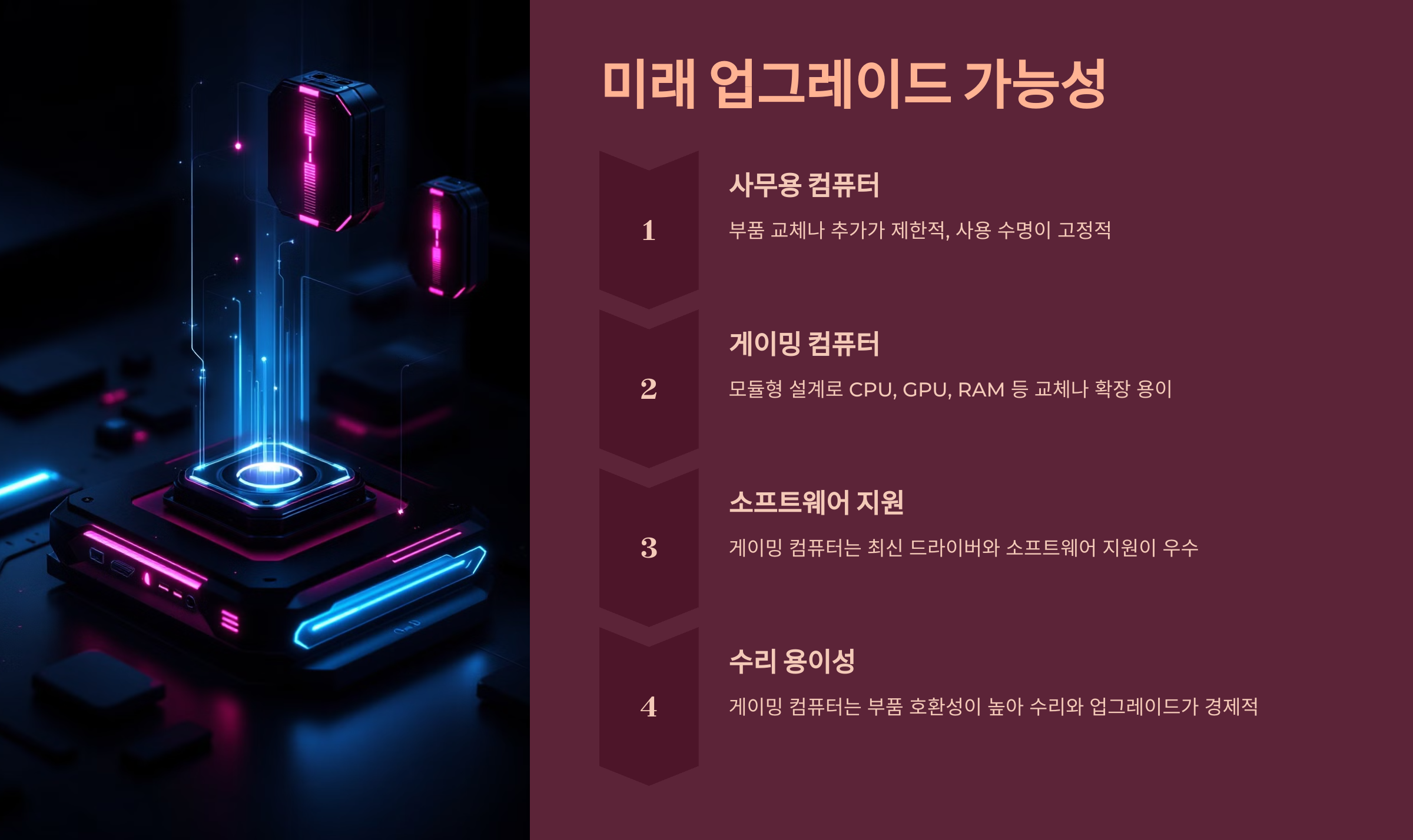 미래 업그레이드 가능성은 투자 가치를 결정짓는 중요한 요소 중 하나예요. 게이밍 컴퓨터는 이 부분에서 사무용 컴퓨터보다 더 많은 가능성을 제공해요: