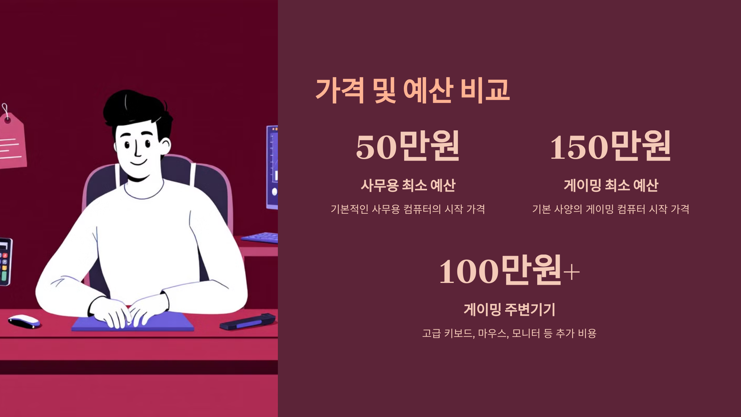 가격은 두 컴퓨터를 비교할 때 가장 큰 변수 중 하나예요. 일반적으로 사무용 컴퓨터는 50~100만 원대의 예산으로 충분하지만, 게이밍 컴퓨터는 최소 150만 원 이상이 필요할 때가 많아요.