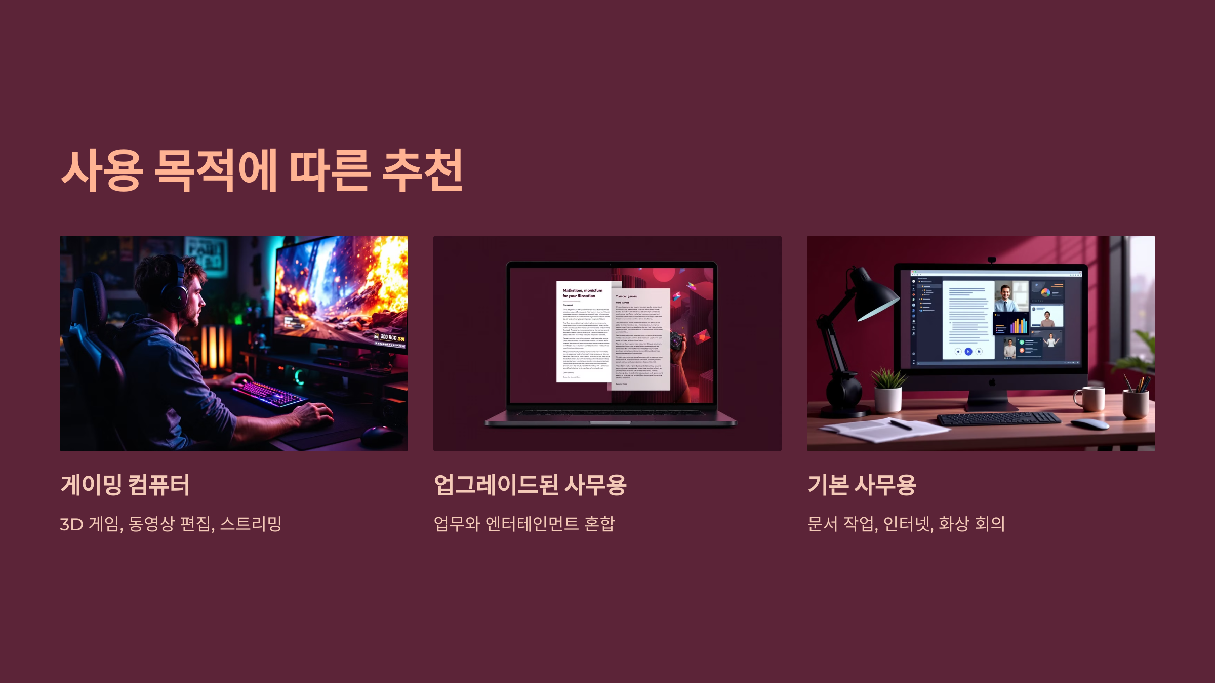 사용 목적은 최적의 선택을 결정하는 데 가장 중요한 요소예요. 상황별로 어떤 컴퓨터가 적합할지 정리했어요: