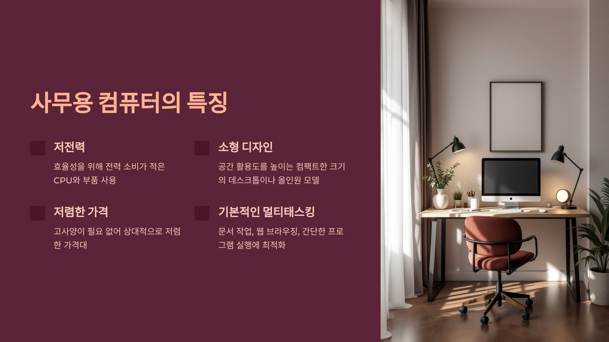 사무용 컴퓨터는 보통 고성능을 요구하지 않는 작업을 수행하기에 적합해요. 주요 특징은 다음과 같아요: