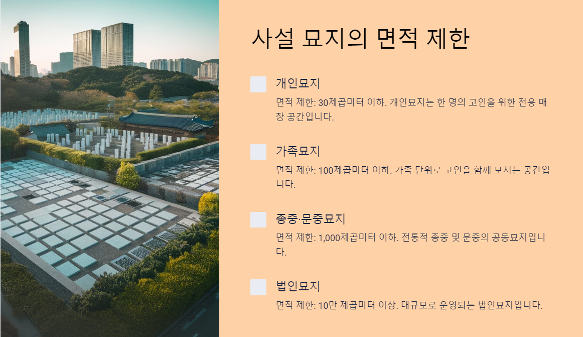 사설 묘지는 고인을 매장하기 위한 장소로 개인, 가족, 종중, 법인 등 다양한 형태로 나뉩니다. 다음은 각 유형별 면적 제한입니다.