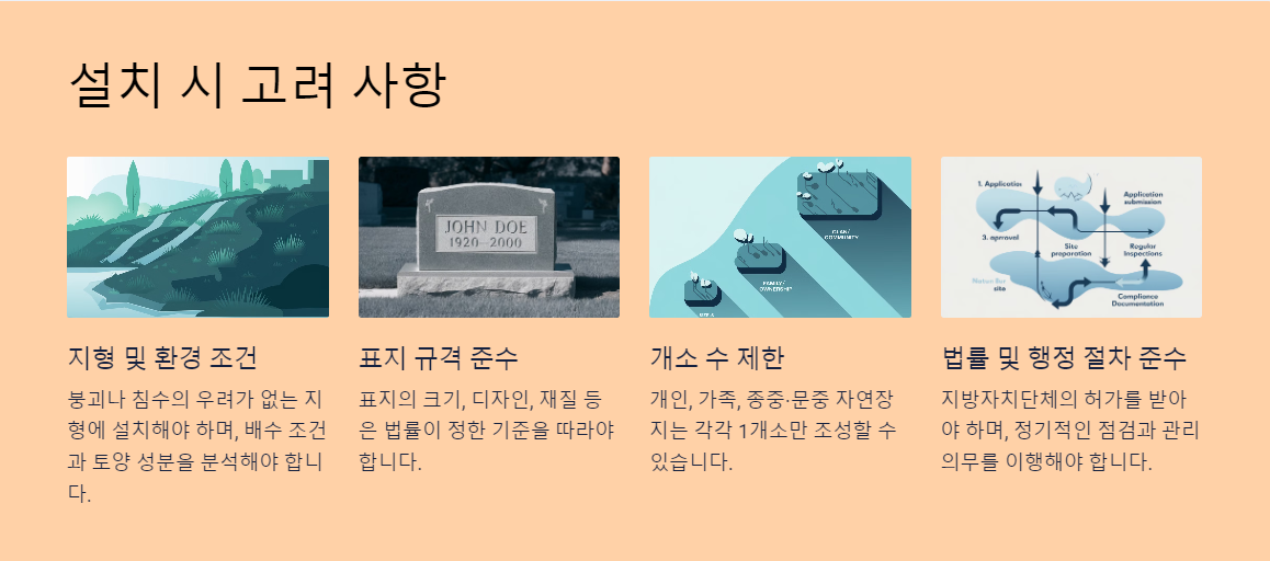 - 묘지 및 자연장지의 표지 크기, 디자인, 재질 등은 법률이 정한 기준을 따라야 합니다.