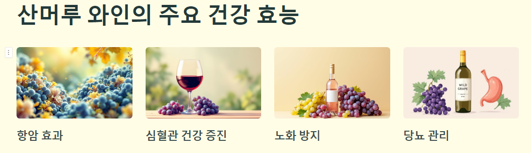 산머루 와인에 포함된 레스베라트롤은 심혈관 건강을 증진시키고 염증을 완화하는 데 탁월합니다. 또한, 혈액순환 개선과 혈관 건강 유지에도 큰 도움이 됩니다.