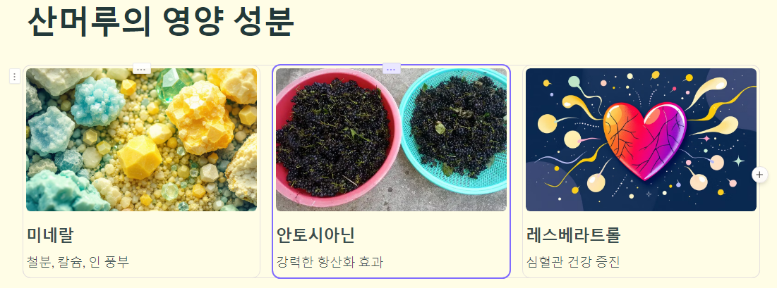 산머루는 일반 포도에 비해 훨씬 더 많은 영양소를 함유하고 있습니다. 주요 성분으로는 철분, 칼슘, 인, 안토시아닌, 그리고 레스베라트롤이 있습니다.