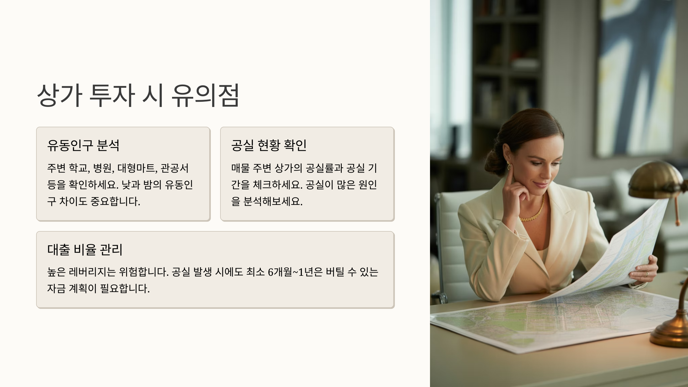 대출 비율도 아주 중요해요. 너무 높은 비율로 레버리지를 쓰게 되면 공실 발생 시 감당이 어려워질 수 있어요. 월세가 끊겼을 때도 최소 6개월~1년은 버틸 수 있는 자금 계획을 세워야 해요. 상가는 매달 꾸준히 수익이 나야 하는 투자 상품이니까요.