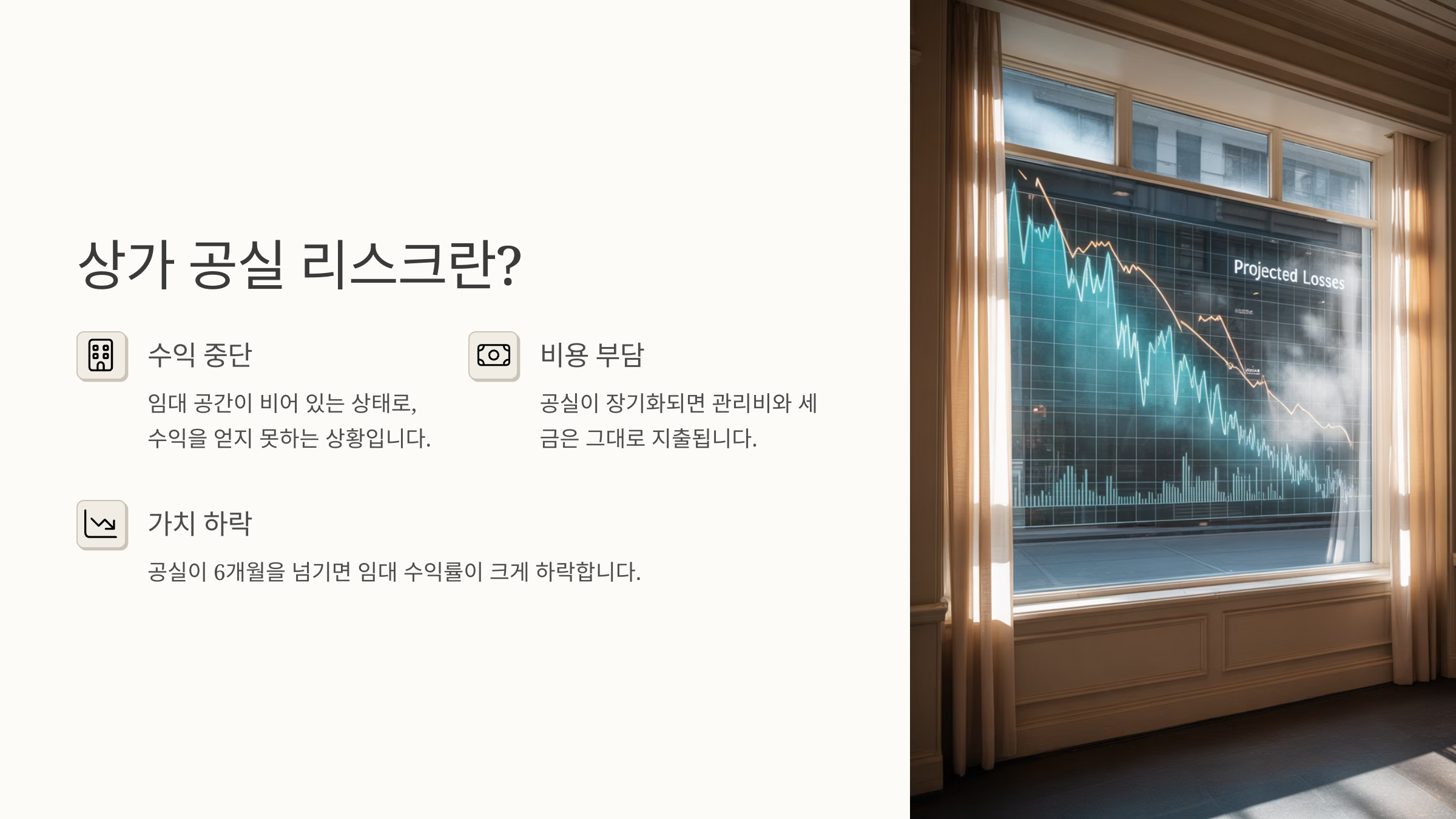 상가 공실 리스크는 임대 수입이 끊기면서 발생하는 금전적인 손해뿐 아니라, 장기적으로 자산 가치 하락, 관리비 부담 증가, 부동산 신용도 하락까지 이어질 수 있어요. 그래서 공실률 관리가 상가 투자에서 가장 중요하다고 해도 과언이 아니에요.