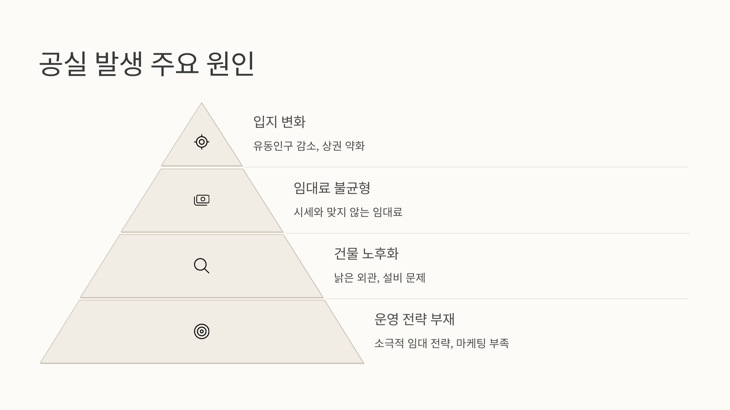 또 다른 원인은 건물주의 소극적인 임대 전략이에요. 광고 부족, 공실 대응 미비, 임대 협상 능력 부족 등이 겹치면 빈 공간은 점점 늘어나고, 공실 기간도 길어지게 되죠. 무계획적인 상가 운영은 장기 공실로 이어질 가능성이 아주 커요.