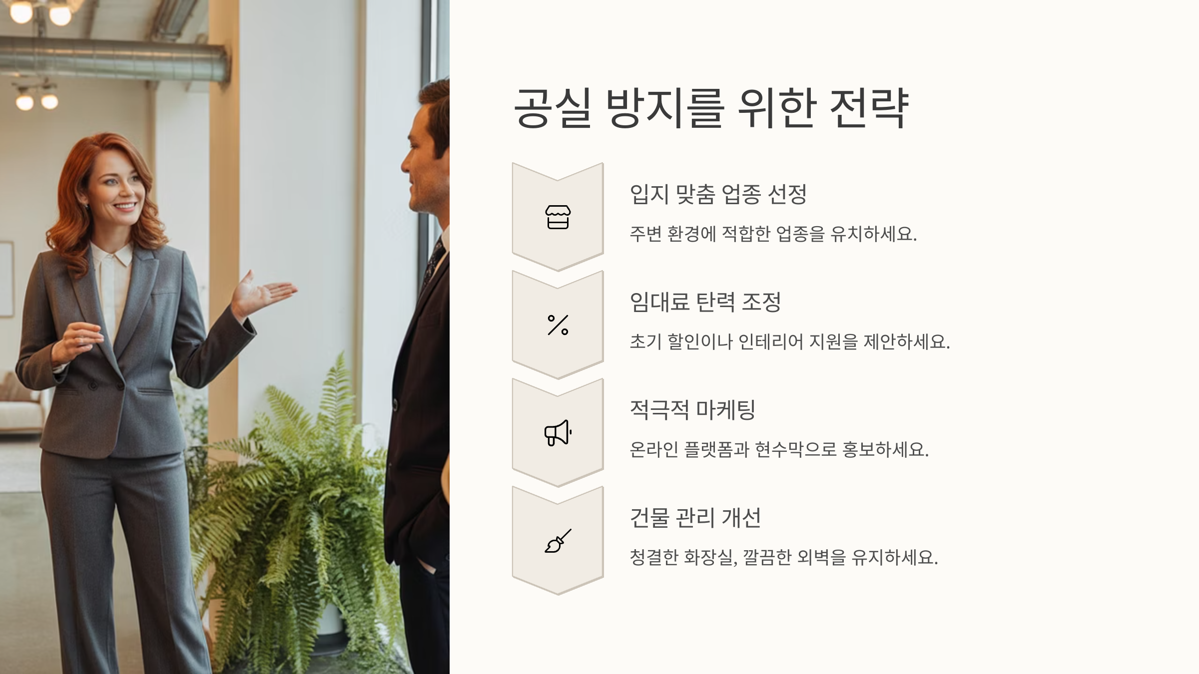 또한 장기 공실은 건물 전체의 이미지도 깎아먹어요. 특히 상가처럼 다수의 임차인이 입점해 있는 구조에서는 빈 점포 하나가 전체 분위기를 가라앉히는 효과를 가져와요. 지나가는 사람들이 “여긴 장사 안 되나 봐”라는 인식을 갖게 되는 거죠.