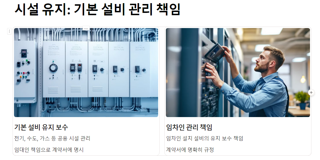 예: "임대인은 전기와 수도 등 기본 설비의 정상 작동을 보장하며, 고장 시 즉시 수리를 진행해야 한다." - 임차인 관리 책임