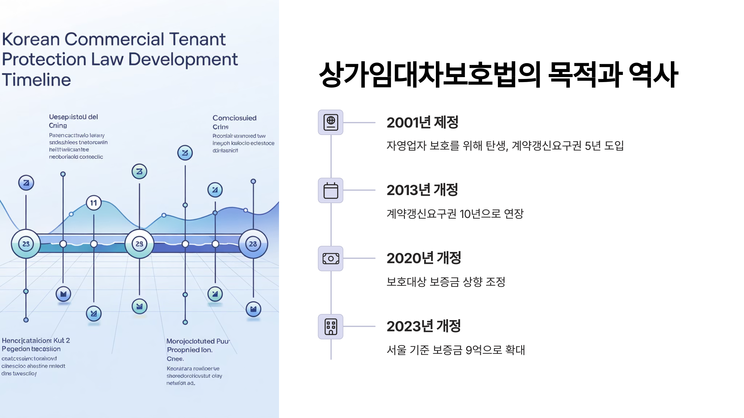 이처럼 상가임대차보호법은 자영업 생존권 보장이라는 사회적 배경 아래 만들어졌고, 지금까지도 많은 이들에게 실질적인 보호를 주고 있어요. 💼