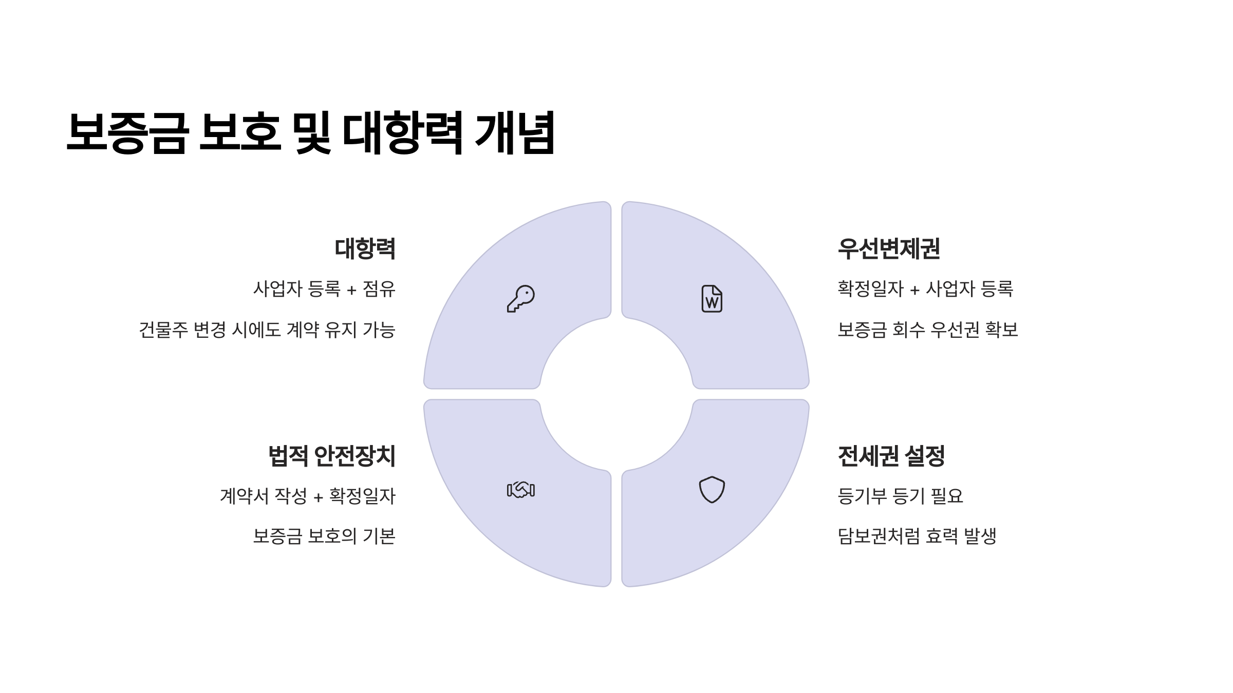 | 우선변제권 | 확정일자 + 사업자 등록 | 보증금 회수 우선권 | 계약 종료 시점 |