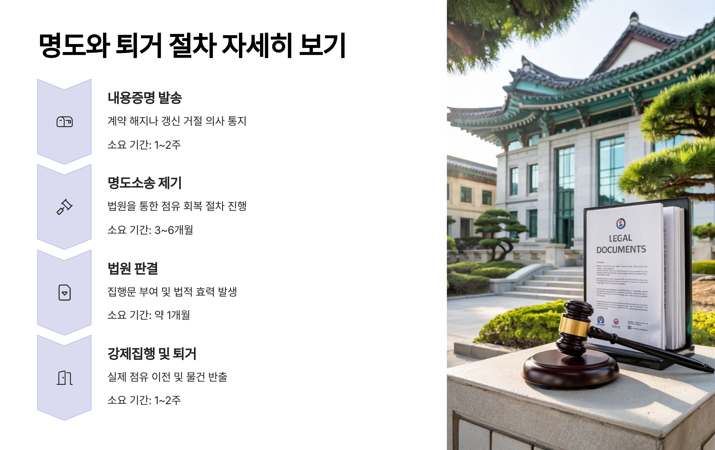 상가 임대차에서 계약 만료 후 가장 큰 갈등이 발생하는 부분이 바로 명도, 즉 퇴거 절차예요. 임대인이 점포를 반환받지 못하거나, 임차인이 권리금을 회수하지 못한 채 쫓겨나는 일이 자주 발생해요. 그래서 명도 절차는 반드시 미리 알고 준비해야 해요.