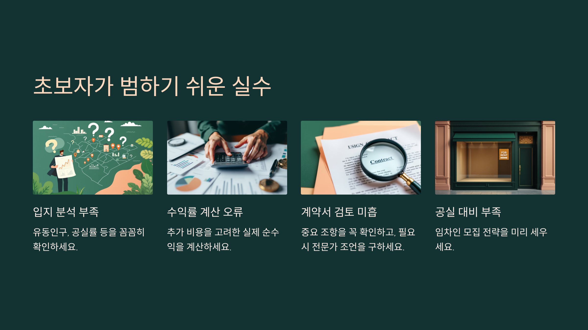 계약서를 꼼꼼히 읽지 않고 서명하는 것도 큰 실수예요. 임대료, 관리비, 계약 갱신 조건, 권리금 등 꼭 확인해야 할 조항들이 많아요. 변호사나 전문가에게 검토를 받는 것도 좋은 방법이에요.