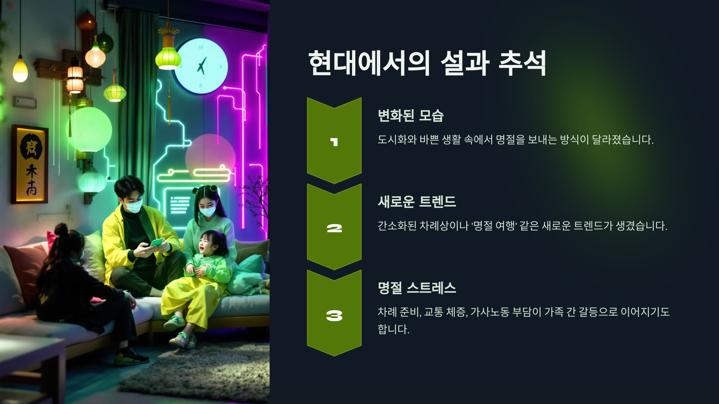 현대 사회에서는 설과 추석의 모습이 많이 바뀌었어요. 예전에는 농촌 중심의 전통적인 풍습이 강조되었다면, 지금은 도시화와 바쁜 생활 속에서 명절을 보내는 방식도 달라졌죠. 설과 추석은 여전히 가족 중심의 문화가 강하지만, 간소화된 차례상이나 '명절 여행' 같은 새로운 트렌드도 생겼답니다.