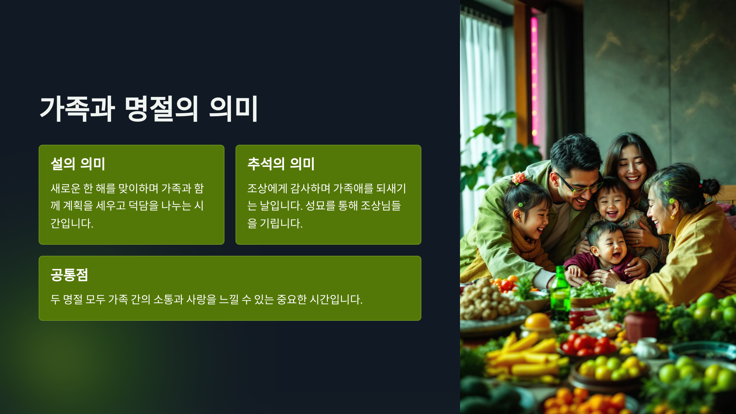 설과 추석은 단순히 전통을 이어가는 날이 아니라, 가족 간의 소통과 사랑을 느낄 수 있는 중요한 시간이기도 해요. 이 때문에 한국인들에게 명절은 단순히 하루를 기념하는 것을 넘어 인생의 중요한 부분으로 자리 잡고 있어요.