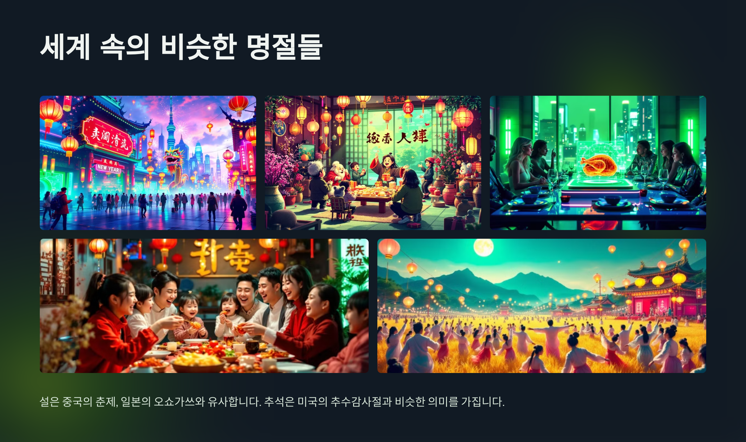이런 유사성과 차이점을 통해 한국의 설과 추석은 세계 문화 속에서 독특한 위치를 차지하고 있답니다.