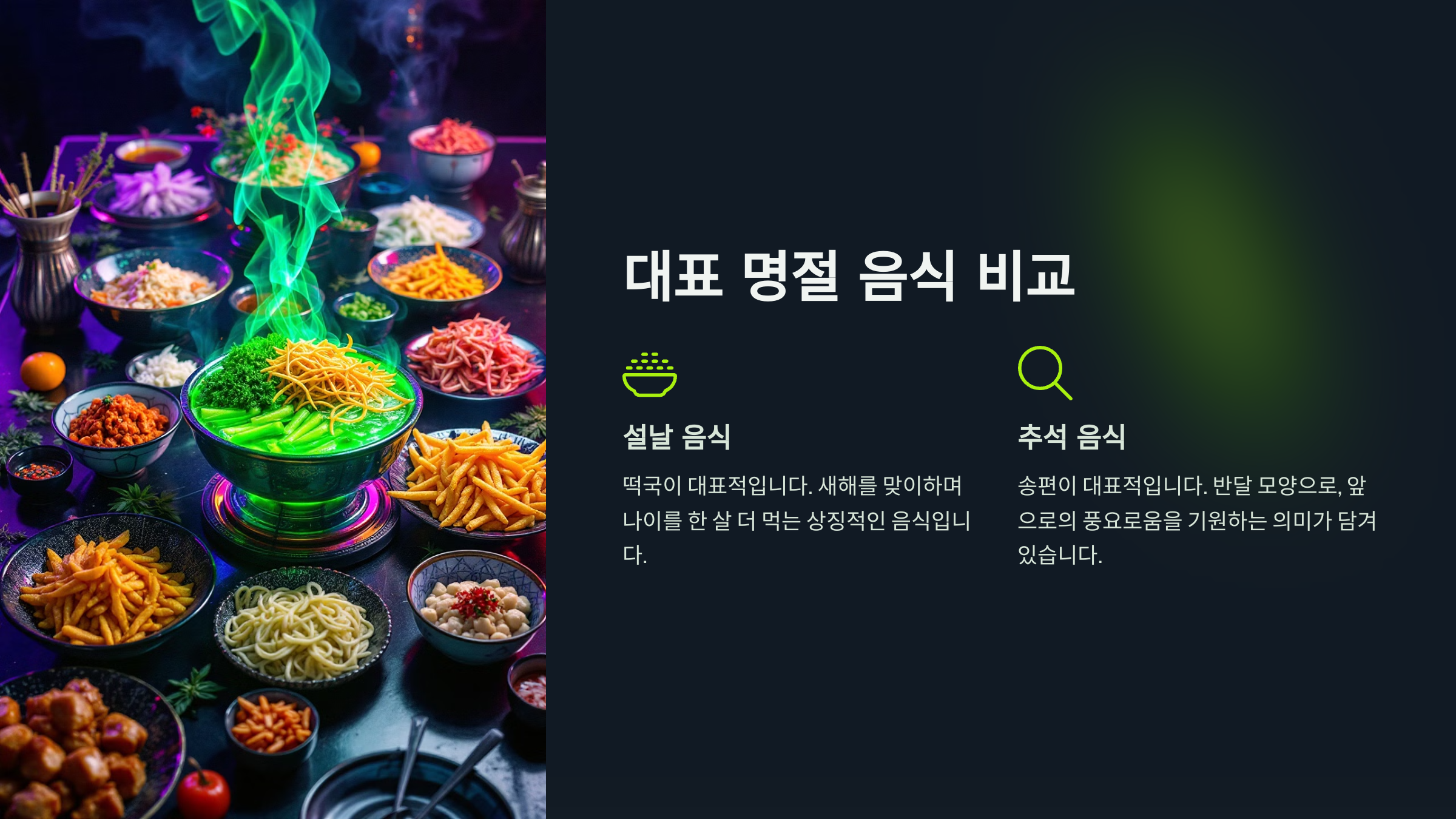 설과 추석의 차이를 나타내는 가장 뚜렷한 요소 중 하나는 바로 음식이에요. 설날에는 떡국이 빠질 수 없어요. 떡국은 가래떡을 썰어 만든 국으로, 새해를 맞이하며 나이를 한 살 더 먹는 상징적인 음식이에요. 이와 함께 전이나 갈비찜, 잡채 같은 다양한 명절 음식이 함께 준비되죠.
