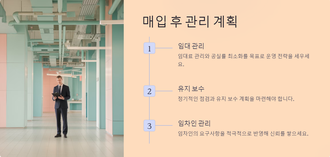 건물 매입 후 철저한 관리 계획이 필요합니다.