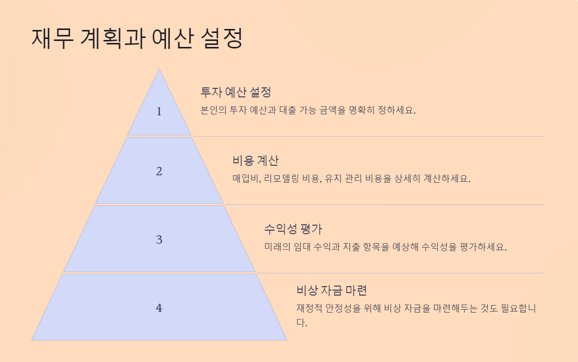 먼저 본인의 투자 예산과 대출 가능 금액을 명확히 정해야 합니다.