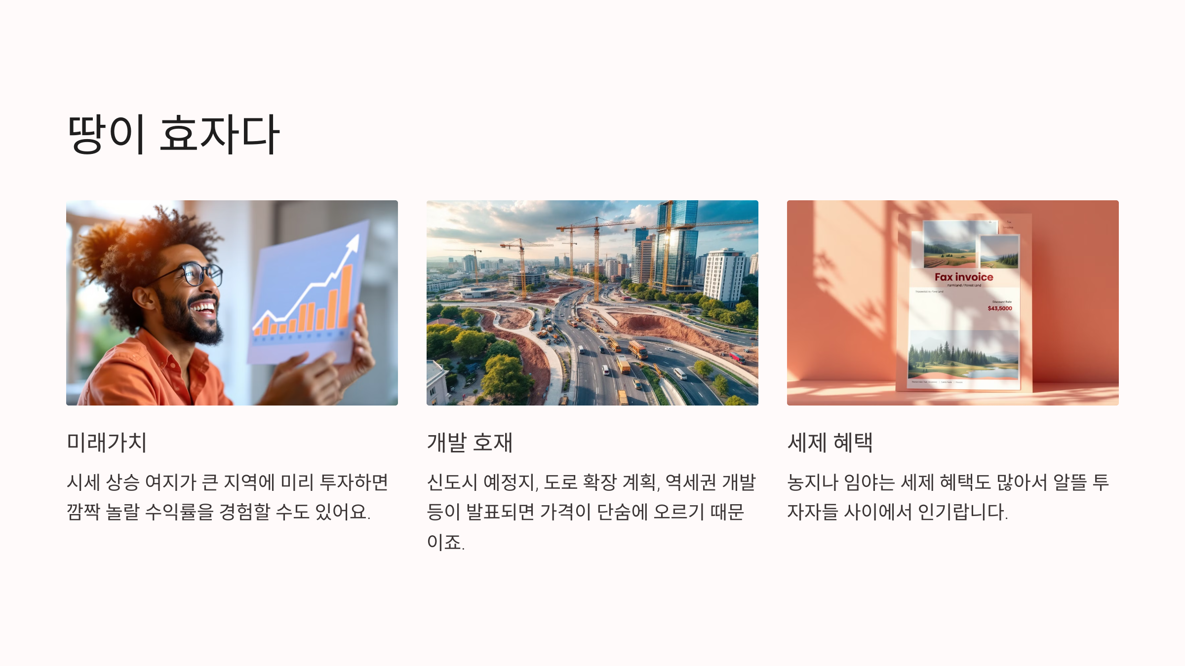 땅은 가만히 놔둬도 돈이 되는 자산이에요. 임대 수익 없이도 보유만 해도 가치가 오르는 경우가 많죠. 그래서 땅을 ‘효자 자산’이라고 불러요. 특히 시세 상승 여지가 큰 지역에 미리 투자하면 몇 년 후엔 깜짝 놀랄 수익률을 경험할 수도 있어요.