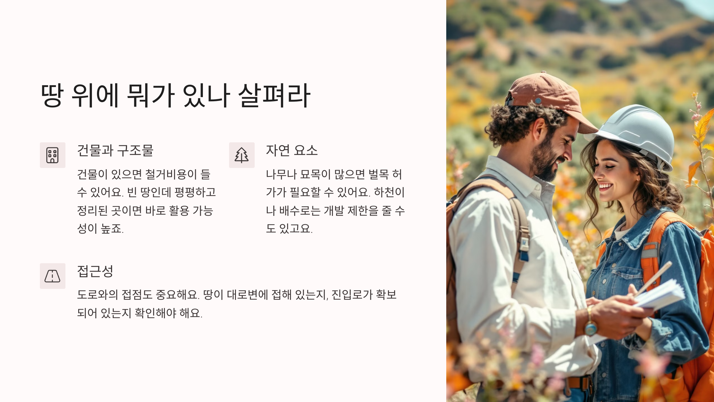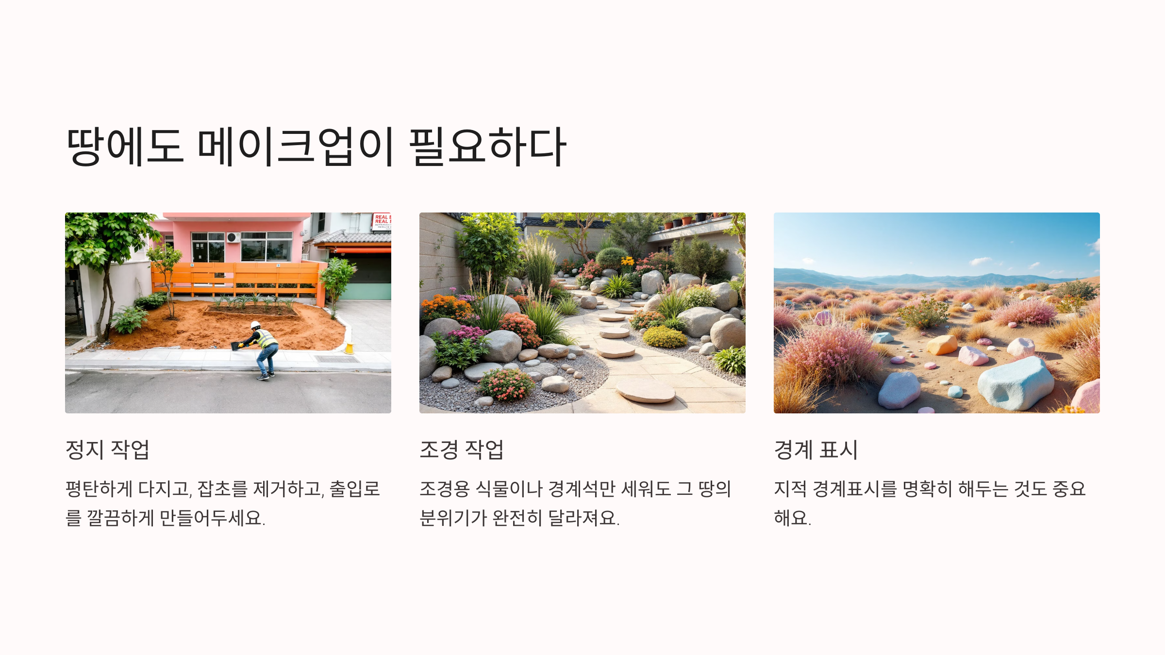 땅도 손질이 필요해요. 아무리 위치 좋은 땅이라도 방치되어 있으면 사람들이 쳐다보지도 않거든요. 그래서 땅에도 ‘화장’이 필요해요. 쉽게 말해 땅을 정리하고, 주변을 깔끔히 다듬는 것만으로도 가치는 확 올라가요.