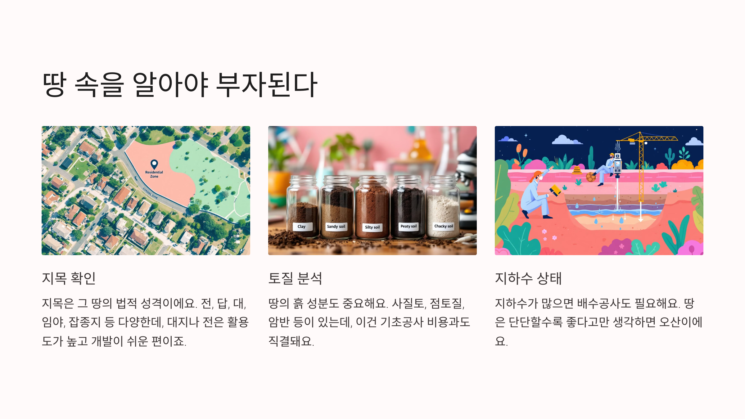 땅 속 이야기는 조금 복잡하지만, 절대 빼놓으면 안 되는 부분이에요. 겉은 평범해 보여도 땅 아래에 어떤 사정이 숨어 있는지에 따라 투자의 성패가 갈리거든요. 특히 지목, 토질, 지하수 상태는 무조건 체크해야 해요.